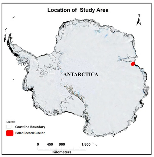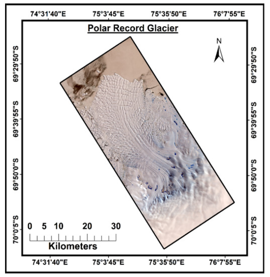 The Polar Record Glacier (PRG) (as shown in Figure 1) is located 69.5° S, 75.4° E (Figure 2) on Princess Elizabeth land. It is one of the largest outlet glacier flow that is situated near Larsemann Hills in East Antarctica. It is one of the outlet glaciers besides the Ingrid Christensen coast that is bounded by Dodd Island and Meknattane Nuntaks [7]. The Indian Antarctic Research station Bharati is located to the northeast, about 50 km from this glacier. Using satellite data from 1937 to 1947, Roscoe, a geographer in the United States (US), detected an ice tongue extending ~ 70 km into the open sea and he predicted that the tongue would calve when it encounters Amery Ice Shelf (AIS) which was confirmed that a large ice piece broke away into the sea between 1980–1990. Further monitoring has revealed that the total area is decreasing every year: from 450 km² it decreased to 300 km² after several calving events. Ref. [8] claimed that the surface velocity of the tongue enhanced by 19% from 140 to 580 ma−1 in winter to 720 ma−1 in the summer.