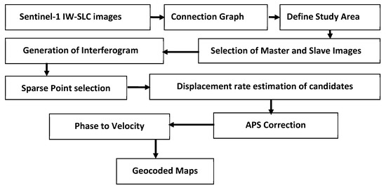 For the velocity calculation of study area, we used the PSInSAR method where all of the SAR single look complex (SLC) images were involved for co-registration. As mentioned earlier, in the PSI method the number of images affects the accuracy of the results because the co-registration depends upon the amplitude of the signal [14]. The SARPROZ software that was used to generate the velocity map from the SAR data, has its own inbuilt module to handle every step of the functions, and the function is further parted in sub-function, as shown in Figure 3.