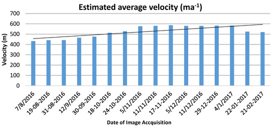 It is possible to find the velocity of the glacier using C-band sensor satellite with an accurate result. Polar Record glacier is very fast flowing glacier. The velocity of PRG was estimated to be around 2 mday−1 for the tongue portion and nearly 1 mday−1 at upper inland area. The results showed that at lower altitude the velocity was 700–750 ma−1, whereas at higher altitude toward eastern side of the glacier flow, it was 300–400 ma−1. In the PSInSAR method on Interferometric SAR data for estimating glacier velocity, the accuracy of the results varied according to the coherence level of the SAR images; those having higher coherence (>0.92) yielded accurate results. As the coherence decreased, it was not feasible to proceed with the SAR images. Every image is used as a master image once, with respect to rest of the images as slave mentioned in Table 3. The estimated velocity with different images is graphically represented in Figure 4.