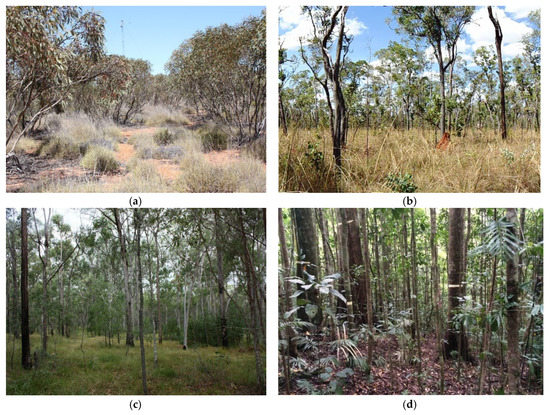 Study site field photography: (a) Chowilla; (b) Litchfield; (c) Karawatha; (d) Robson Creek.