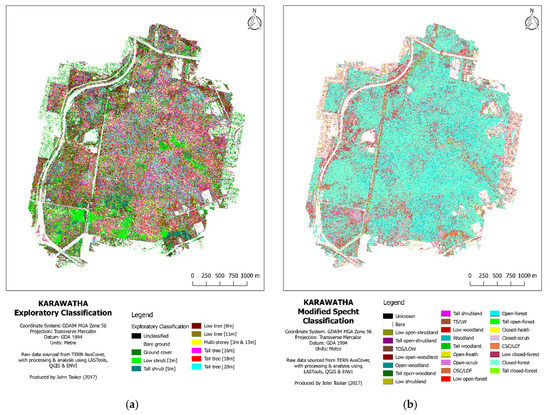 Classification comparison for Karawatha study site between (a) LiDAR-derived exploratory classification; (b) Specht classification. See presentation for higher resolution maps.