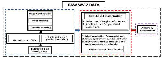 We followed the preprocessing procedure [8] of image rectification and restoration in order to prepare the image for the extraction of targeted information. The preprocessing performed in this study is depicted in Figure 1, and consisted of five steps: (a) Data calibration; (b) Mosaicking; (c) Pan sharpening; (d) Generation of 3D surface; (e) Extraction of glacier area. The raw data was obtained from DigitalGlobe in the form of 21 individual tiles. These tiles were already geometrically corrected to the projection system of UTM WGS 84 43N and the geographic co-ordinate system of GCS WGS 1984. Data calibration was carried out in two steps: (1) The conversion of raw DN values to sensor spectral radiance; (2) The conversion of sensor radiance to sensor or surface reflectance [9]. The latter is also known as atmospheric correction and was performed by using the FLAASH atmospheric correction module available in ENVI 5.3. Mosaicking of the calibrated data was performed by using seamless mosaicking (ENVI 5.3) to append each of the 21 tiles to produce a single image of the region. Following reference [10], we pansharpened the calibrated data by using Gram Schmidt (GS) which is the optimal method for land-cover classification. To extract the test glacier, a precise delineation of the glacier boundary was crucial. To achieve greater accuracy, the pansharpened image was draped on a 3-dimensional surface model of the study area generated from Aster GDEM v2 with 30 m spatial resolution. The delineated boundary was then used to clip the study area from the whole region. This procedure was carried out in ArcGIS 10.3.