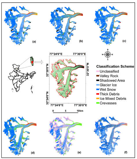 Location map of the study glacier along with classification outputs, i.e., (a) Object-based classification (OOC); (b) Mahalanobis distance (MHD); (c) Minimum distance to mean MD; (d) Maximum likelihood (MXL); (e) Parallelepiped (PP) and (f) Spectral angle mapper (SAM).