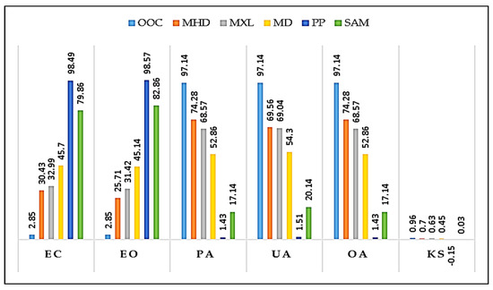 The reference points were selected using visual interpretation and analysis of spectral plots of the target spectra. Error matrices were employed to measure the accuracy (Figure 3) of the classification outputs. On comparative analysis of the results obtained, it is evident that the pixel-based methods were inferior to the object-based techniques. The parallelepiped classifier (Figure 2e) was the most inaccurate of the supervised classifiers tested in this study. This classifier obtained the highest over-estimation, as most of the reference pixels were classified incorrectly. This classifier also resulted in the greatest under-estimation, as it produced the largest amount of unclassified area. The Kappa statistics (Figure 3) obtained by the PP classifier rendered a negative value (−0.15). This could be due to the large areas left unclassified. Among the other supervised classifiers, the performance of the SAM (Figure 2f) was only marginally better than that of the PP. However, the MXL (Figure 2d) and the MD (Figure 2c) delivered below acceptable standards of accuracy, with overall accuracies of 68.57% (ĸ = 0.63) and 52.86% (ĸ = 0.45), respectively. The MHD (ĸ = 0.7) achieved the lowest error of commission (30.43%) and omission (25.71%) (Figure 3), while delivering the highest overall accuracy of 74.28% among the pixel-based classifiers. The OOC method (Figure 2a) was outstanding, as it achieved remarkably low errors of inclusion and exclusion (2.85% each), while delivering an overall accuracy of 97.14%. With a kappa index of 0.96, this proved to be the most accurate and reliable classification scheme (Figure 3).