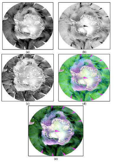 A sample of the generated principal components for a particular day is given in Figure 3 top panel (a–c). The first principal component (PC1) explains the largest percentage of total variance [20] followed by PC2 and PC3. The false-colour composite (FCC) image, shown at the bottom of Figure 3c, is generated using these three principal components as the input channels of red, green, and blue, respectively. In this FCC, regions with pinkish and greyish shades represent the sea ice area around Antarctica, while the green and black shades represent ocean. The FCC RGB image is transformed to hue, saturation, and value (HSV) colour space (Figure 3d) using the HSV transformation in ENVI software. This process replaces the value band with the high-resolution image, then it automatically resamples the hue and saturation bands to the high-resolution pixel size using cubic convolution technique. Ultimately, there is the final transformation of the image back to RGB colour space. The output RGB images will have the pixel size of the input high-resolution data.