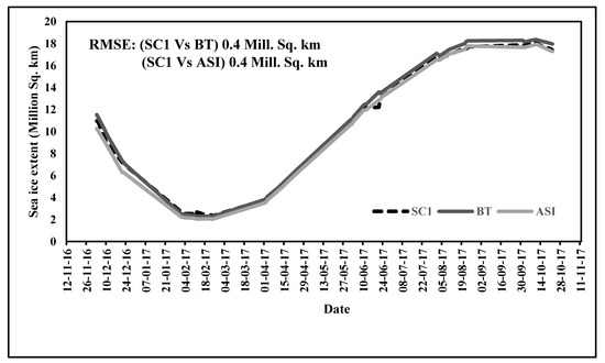 The derived sea ice extents (SIE) are compared with the extents obtained from passive microwave observations. Advanced microwave scanning radiometer-2 (AMSR2) on-board the Japan Aerospace Exploration Agency- JAXA’s Global Change Observation Mission-Water (GCOM-W or “Shizuku”) satellite constantly observes the sea ice regions of the Earth. Remote Sensing of Polar Regions research group at the Institute of Environment Physics (IUP), University of Bremen, generates sea ice concentration (SIC) data for both the Polar Regions. The SIC data are derived at 3.125 km and 6.25 km resolution, respectively, using the ARTIST Sea Ice algorithm [12] and the Bootstrap algorithm [13]. We use 15% SIC in both the data products as the threshold to designate a pixel as sea ice [14,15] and generate sea ice extent maps using this threshold.