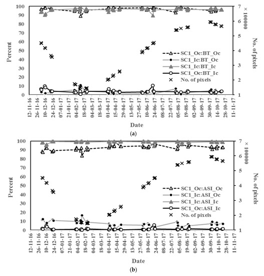 Pixel-wise mapping accuracy for the comparison between (a) SCATSAT-1 (SC1) and Bootstrap (BT), and (b) SC1 and ASI sea ice extent estimates. ‘Oc’ represents ocean and ‘Ic’ represents sea ice. Details are discussed in Section 4.