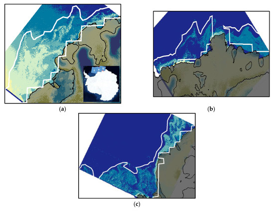 For this study, we have chosen three sites in East Antarctica (Figure 7). The white solid line is the sea ice edge estimated by our SCATSAT-1 algorithm for 20 January 2018. It is apparent our sea ice edge closely matches the SAR imageries. However, it may be noted here that the SAR scenes are one-minute observation of the region at a given local time and our SCATSAT-1 data are daily-averaged. Therefore, there will be some differences in the observation even though the “actual” sea ice edge looks similar to our estimated edge.