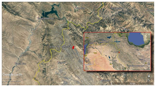 The study area is located to the south of Halabjah, the closest city to the earthquake’s epicenter, which was located at 34.88° N and 45.84° E near the Iran–Iraq border (according to the National Center of Broadband Seismic Network of Iran). Most of the damage occurred in the Sarpol-e Zahab, Qasr-e Shirin, and Eslamabad-e Gharb counties [9] (Figure 1).