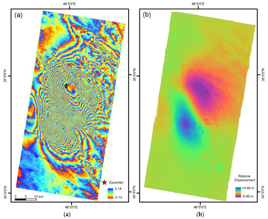 Earthquakes are one of the most destructive natural phenomena in the world. The rapid and accurate estimation of the location and the amount of deformation is a challenging task in geoscience. In addition, it is important for rescue operations [1,2]. Synthetic aperture radar interferometry (InSAR) technology is one of the powerful tools to measure deformation and/or deposition on the ground’s surface. Sentinel-1(A/B) data provides synthetic aperture radar (SAR) images for investigating geohazards all over the world [3]. Sentinel-1 provides radar data with a range of between 5 to 22 m, depending on the different products [4]. Before Sentinel-1 began operating, there were other SAR systems, such as ERS-1 and -2, Radarsat-1 and -2, ENVISAT, and JERS. However, these sensor systems have completed their lives. Sentinel-1 can be easily accessible and was launched in 2014 [5,6].