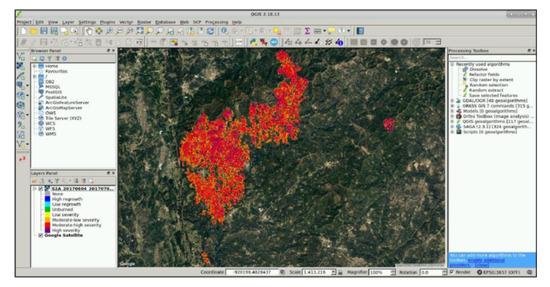 Two Sentinel-2 products acquired before and after a series of wildfires which affected central Portugal in June 2017 are used to map the location and intensity of damage (burn severity). The exercise exploits ESA’s Open Source Sentinel-2 Toolbox to process Sentinel-2 data, comparing pre- and post-event imagery and calculating the Relativized Burn Ratio (RBR) [4]. Processed results are then exported to an Open source GIS (QGIS)—Figure 2, where post-processing (classification of severity level, following USGS suggested classification) is performed. RUS VM are used for running the exercise.