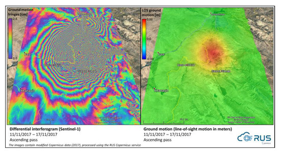 Use of RUS for Earthquake studies. (a) Fringes computed from 2 ascending InSAR pairs acquired by Sentinel-1 before and after the Iran earthquake of 12 November 2017; (b) Deformation field (along satellite’s line of sight) extracted from the observations.
