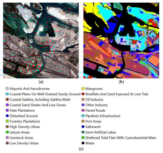 In this study, we considered an area in Abu Dhabi, as shown in Figure 1. The area is represented by 22 land cover/land use classes out of the 54 classes defined by the EAD. It has a diverse setting, with part of Abu Dhabi city in the south and various islands in the north, with significant human activity. The region also consists of mangroves along the Abu Dhabi coast.