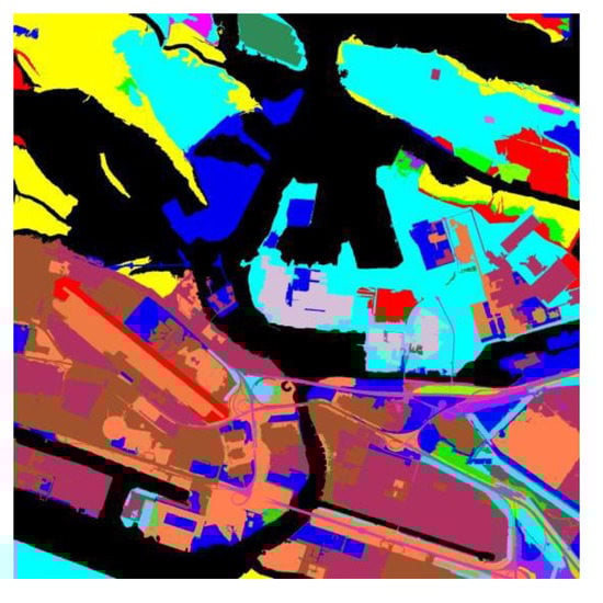 The image was acquired by WorldView-2 satellite in 2012 and consists of data acquired in eight bands in visible, near-infrared (NIR) and shortwave infrared (SWIR) regions at a spatial resolution of 1.85 m for the multispectral images and 46 cm for the panchromatic image. The panchromatic image consists of 20,000 × 20,000 pixels. A snapshot of the image and the corresponding land use/land cover map from the EAD database is shown in Figure 2. The corresponding legend shows the 22 classes considered in the study. It can be clearly observed that several of these classes are highly heterogeneous spatially, e.g., airports and aerodromes, disturbed ground, industry classes, urban classes, etc., as they correspond to land use rather than land cover.