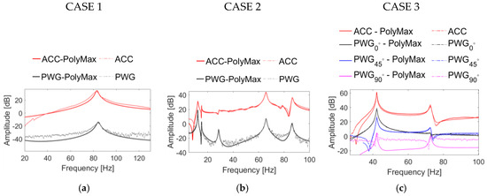For the estimation of the modal parameters, the frequency bands 0–120 Hz, 0–100 Hz and 0–100 Hz were considered respectively for CASE 1, CASE 2 and CASE 3. Figure 3 shows representative frequency response function (FRF) amplitudes obtained for each of the test cases. Table 2 and Table 3 report the first three estimated resonance frequencies and damping ratios for both ACC and PWG measurements for all three cases.