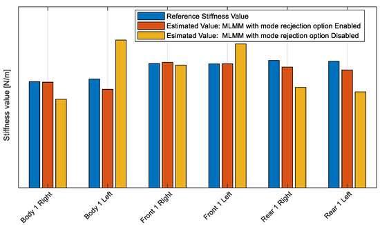 The comparison between the modal model identified by the MLMM and the initial one is presented in Figure 1 by comparing one of the synthesized FRFs to the measured one. Clear advantage of MLMM usage is demonstrated in Figure 1 where the obtained modal model closely fits the measured FRF in comparison with the initial modal model. By using the identified modal model that represents this dynamic data the static stiffness can be identified by excluding the rigid body and the out-of-band behavior from the modal model. The stiffness value estimated for some points using the identified MLMM modal model is shown and compared to the expected (reference) values in Figure 2. In this figure, the impact of the new option added to the MLMM estimator, which enables the rejection of the modes that have a PMS, on the reliability of the results is demonstrated. A trimmed body (TB) modal model is built based on MLMM enabling the PMS modes rejection option and a second TB modal model is built using MLMM while disabling that option. The reference value shown in Figure 2 is estimated based on modal model that has been built by fitting an FRFs matrix that has 40 columns (i.e., 40 excitation locations) using MLMM. Results in Figure 2 are shown for point pairs, i.e., each point exists on the both sides of the car.