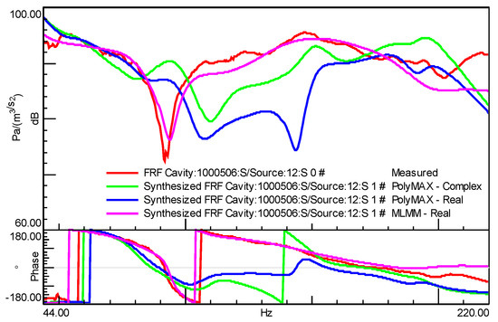 In this application, many excitation locations were also needed as in the previous example as well to get sufficient excitation of the acoustic modes across the entire cavity of the car and to avoid mode shape distortion that typically occurs when low number of acoustic sources are used [9]. Multiple inputs multiple outputs (MIMO) acoustic modal analysis test was carried out inside the cavity of a car where the car cavity is acoustically excited at 12 locations using loudspeakers and the sound pressure is measured at 612 locations using microphones. Detailed description of the measurement can be found in [7]. The FRFs matrix used for the modal parameter estimation consists of 527 rows, 10 columns, and 450 spectral lines. It has been observed that the classical modal parameter estimation methods have some difficulties in fitting an FRFs matrix with such number of columns (i.e., inputs) [8,9]. The LMS Polymax estimator was applied to that large database in the frequency band of 44 till 220 Hz. Based on the Polymax stabilization chart, 13 modes were retained. The acoustic cavity and the flexible walls of the cavity constitute a coupled vibro-acoustic system and hence the modes of the system generally will consist of an acoustic part (pressure waves in cavity air) and a structural part (flexural waves in cavity walls). Therefore, and even though both excitation and measured response quantities are from the acoustic domain, also more structural related modes may be retrieved from the analysis. Nevertheless, it appears that the selected modes are to a large extent “acoustically dominant” modes. Using the same Polymax poles, both real and complex mode shapes have been estimated. The curve-fitting quality is represented in Table 1 (Polymax columns). Afterwards, 10 MLMM iterations are applied to the Polymax initial estimates, both using the general complex mode formulation of the modal model and the constrained real-mode shapes modal model. Also, the MLMM results are represented in Table 1. Whereas Table 1 provides averaged results over all FRFs, Figure 3 shows the curve-fitting results of a typical FRF. From Table 1 it can be concluded that, obviously, the fitting quality degrades when using real instead of complex mode shapes in Polymax (i.e., initial generated modal model).