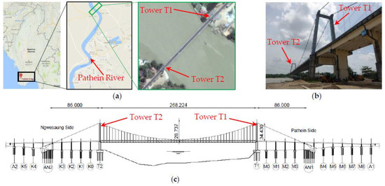 Pathein Bridge. (a) Location of the bridge on Myanmar’s map, (b) picture of the bridge, and (c) elevation of the bridge as per design drawings.