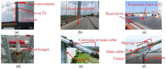 The damages in Pathein Bridge. (a) Inclination of tower T2; (b) road level sinking down; (c) road level drops down after the bearing failed; (d) inclination of hangers; (e) corrosion of the main cable; and (f) slippage of clamps.