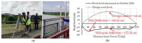 Pathein Bridge has shown various deteriorations; the safety of the bridge is questionable and an immediate assessment and monitoring is crucial. Visual investigations and investigations using drones were carried out in July 2017; the damages of the bridge can be placed into six categories as shown in Figure 3. The top of towers T2 and T1 moved 35 and 21 cm, respectively, towards the main span; excessive deflections in stiffening girder; failure of the bearing downstream of T2; heavy corrosion of main cables and hangers; hangers’ inclination; slippage of clamps. It is notable that the deflection of the stiffening girder is unusual, with maximum deflection of 40.43 cm near tower T2; however, maximum deflection is normally found at the mid-span in single span bridges; Figure 4 shows the road level of Pathein Bridge measured in October 2016.