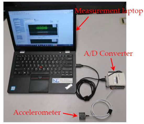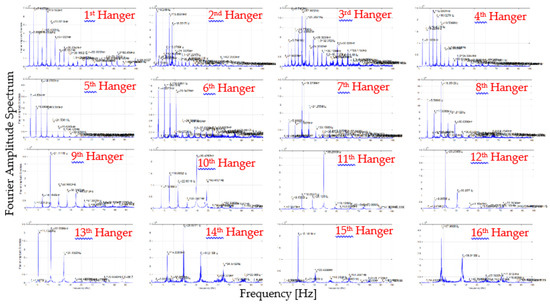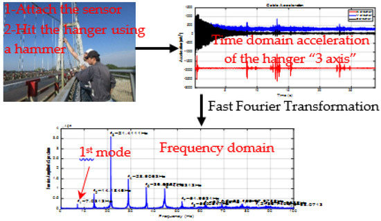 Vibration measurements were conducted in November 2017 to estimate the hangers’ tension force distribution along the bridge. The measurements were conducted using 3-axis piezoelectric accelerometers; Figure 5 shows the measurements’ system. The accelerometer was attached to the hangers using double-sided tape; then, the hangers were excited by hitting them several times using a rubber hammer. The data were collected with a sampling rate of 400 Hz, and the acceleration of the hangers in the direction of bridge axis was considered for the analysis. The data were recorded for 60 s for each hanger, and Fast Fourier Transformation (FFT) was calculated to estimate the frequency property of the recorded acceleration; Figure 6 shows the measurements’ procedures. The 1st mode frequency of 32 hangers out of 52 hangers of each side was successfully estimated; however, the shortest 20 hangers were difficult to estimate and further measurements are required. Figure 7 shows the frequency domain plots of the first 16 hangers in DS (1st hanger is closest to T2).