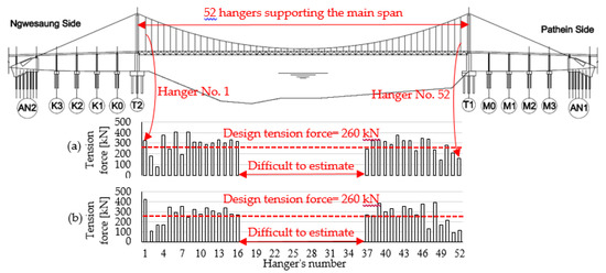 Hangers’ tension force distribution of Pathein Bridge. (a) Tension force of hangers of upstream; (b) tension force of hangers of downstream.