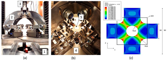Experimental set up; (a) 1. Stereo DIC 2. Biaxial link mechanism 3. Cross-head uniaxial tensile machine; (b) 4. Load cells 5. Perforated cruciform specimen; (c) Perforated cruciform specimen: plastic equivalent strain.
