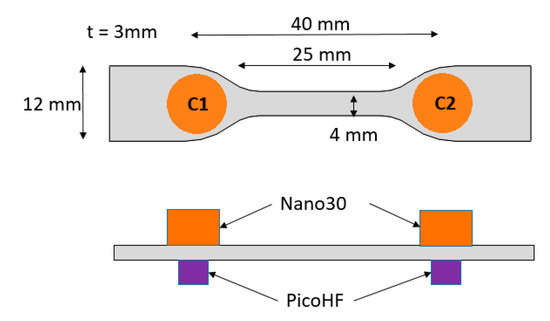 Concerning the AE system, two types of piezoelectric transducers were used as shown in Figure 1, namely the nano30 and the picoHF from Euro Physical Acoustics. The distance between each couple of sensors is 40 mm. These sensors detect signals propagating on the surface of the specimen, and then recorded using a Physical Acoustic PCI-2 system at an acquisition rate of 5 MS/s.
