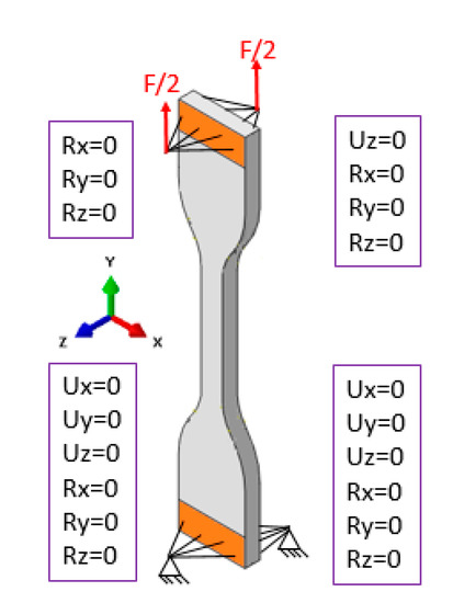 The single fiber fragmentation is modeled using FEM by means of Abaqus® software (6.14-5) with dynamic calculation. We modeled the entire geometry of the specimen: the boundary conditions are shown in Figure 2. The geometry is meshed using tetrahedral elements (type = C3D4), the element size varies between 0.01 mm for fiber and 0.2 mm elsewhere.