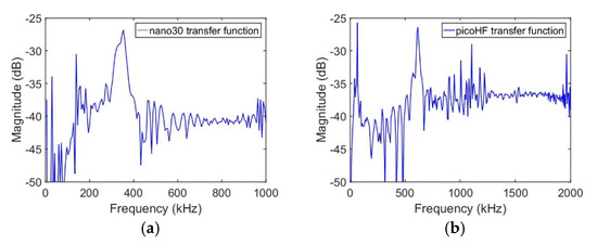 Transfer function of (a) nano30 and (b) picoHF, determined by reciprocity method.