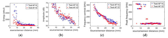 Temporal descriptors vs. source/sensor distance: (a) energy in attoJ, (b) amplitude in dB, (c) frequency centroid in kHz and (d) peak frequency in kHz.