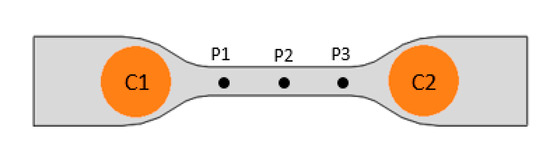 The specimen is made of a single long carbon fiber T700 embedded in epoxy/amine matrix: 1,4-Butanedioldiglycidyl ether (DGEBD)/4,4′-Methylenebis(2-methylcyclohexylamine) (3DCM). The dimension of the specimen is shown in Figure 1.