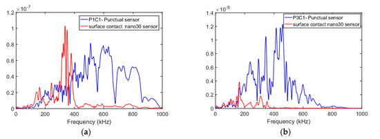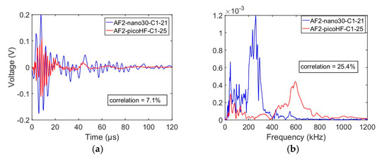 The nano30 is very sensitive around 300 kHz and does not detect high frequency as from 500 kHz. The picoHF is very responsive around 500 kHz and detects high frequencies. Therefore, when sensors detect signals from the same source, they do not respond in the same way. In Figure 9, we compare two signals in the temporal and frequency domain, stemmed from the same source and detected by nano30 and picoHF sensors. These two sensors are equidistant from the source. With a coefficient of correlation of 25% in the frequency domain, it is clear that those different sensors do not detect the same information; especially beyond 200 kHz. Therefore, they give certainly complementary information about the source.