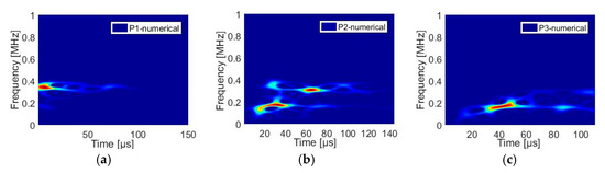 The Figure 8 shows the time-frequency maps assigned to three fiber breaks for three positions on the specimen as shows in Figure 7. The sensor used here is nano30. For fiber breaks near to the sensors (Figure 8a) show a content of high frequency that progressively disappears when the sources become further.