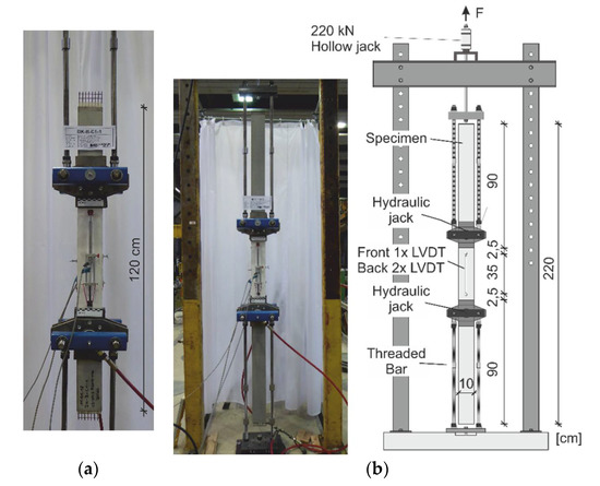 (a) Tensile test setup for specimen with additional coating with epoxy-resin and quartz sand in the anchorage zone; (b) Long tensile test setup for realistic anchorage conditions.