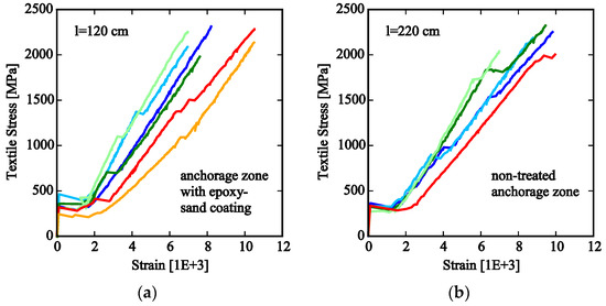 Stress-strain diagrams for specimen with (a) add. coating, (b) non-treated anchorage zone.