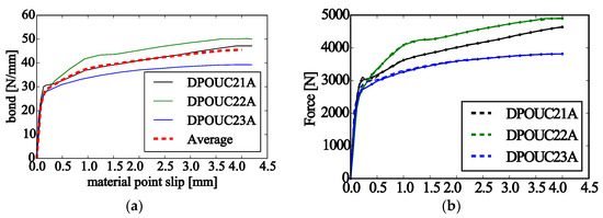 All double-sided pullout specimens failed through pullout of all yarns. The pullout occurred randomly for each yarn at on one side or the other. For three specimen with monotonic loading, the calibration of the local bond-slip laws was performed. In Figure 3a, the calibrated functions are shown. The dashed line represents the vertical average of the three functions and was used for the following simulation of the tensile test. Note that for this specific example with relatively short embedment length compared to the full anchorage length, the direct approach to derive the local bond slip law as known from steel-reinforced concrete by division of the pullout force through the embedded length would lead to similar results as the inverse calibration.
