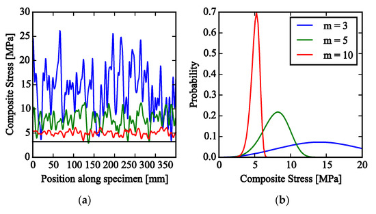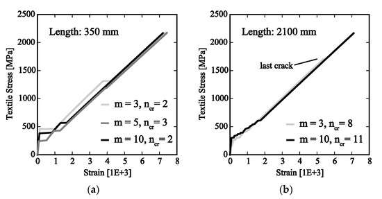 In Figure 5, the results of the simulation for two different lengths are shown. Note that the number of cracks ncr depends on the random position of the cracks along the specimen. Two cracks at the extremities of the specimen—as seen in the experiments near the clamping zone—enable the formation of a third crack (Figure 5a, m = 5) in a late stage of loading when sufficient stress is transmitted via bond. The longer length can be interpreted as a chain of 6 specimen, 350 mm each, with serial coupling. Thus, a comparison of the crack numbers with the experiments is possible. A high scatter of the matrix strength is reflected in a larger range of state IIa (crack formation stage).