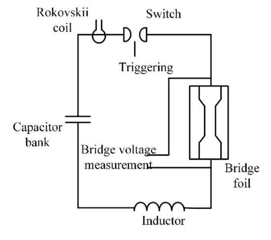 In this experiment, an electric gun with the energy of 14.4 kJ that was operational at Institute of Fluid Physics, CAEP, was employed as a loading device [10]. VISAR was applied to measure the free surface velocity of targets, and the data of the gauge was recorded by an oscilloscope. The principle of the electric gun is based on metal foil explosion by pulsed large current. As illustrated in Figure 1, the electric gun was connected to a series RLC circuit. After the triggering switch turned on, the energy stored in the capacitor was released and a pulsed large current generated. The foil was designed to be the minimum cross-sectional area of the bridge-foil load and the most resistive element in the circuit. Hence, when the transmission line delivered the current from the capacitor bank into a foil, the foil absorbed most of the ohmic heating. If the discharge time of the bank was short compared to thermal diffusion time away from the foil, the metal foil explosion occurred.