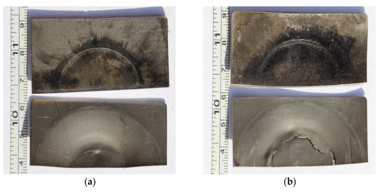 Compared with TC4 thick target of the literature [9], it can be found that from Figure 4 the deformation/failure modes of thin targets are obviously different from those of thick targets. For a single-layer thick target, if the intensity of impulse loading formed by the flyer was large enough and remained for some time, the spall scab was pulled out. For a double-layer thin target, after impacted by a flyer, most of the shock waves induced in the first layer propagated through the interface to the second layer. Then the waves were reflected at the surface of the second layer. The reflected waves collided with the sparse waves reflected by the free surface of the flyer, causing the target’s tensile spallation. On the other hand, the two targets separated when the reflected waves reached their interface. After their separation, the stress waves in the first layer were not large enough to cause spallation, so only inelastic deformation occurred in it. Furthermore, the shock waves confined within the second layer retained most of the energy of the impulse loading. But because the planar stress waves were concentrated mainly within the middle zone, its plastic deformation was also localized in this zone, as shown in Figure 4a. As the velocity (energy) of the flyer increased, the second layer demonstrated a combination failure mode of shear and spallation, as shown in Figure 4b: irregular circle shear cracks on the front side, and spalling cracks on the back side.