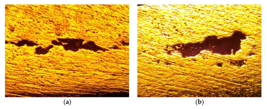 Low magnification microscope image of spall plane region: (a) Sample 1; (b) Sample 2.