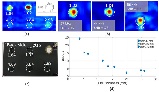 Figure 1a–c shows respectively the FBD over the entire excitation bandwidth, the ODS at LDR of the three FBHs with the lowest remaining material thickness and a picture of the coupon with FBHs of diameter 15 mm where the thickness of each FBH is specified.