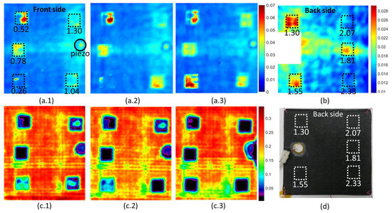 Figure 2(c.1) shows the corresponding ultrasonic C-scan. The FBD shows that there is an increased vibrational response at the locations of the inserts but not over the entire insert’s area. The C-scan also indicates a difference in acoustic impedance between the ‘active’ and ‘inactive’ insert’s areas. Therefore, the test sample has been manually impacted twice with gentle hammer strokes over the total area of the sample.