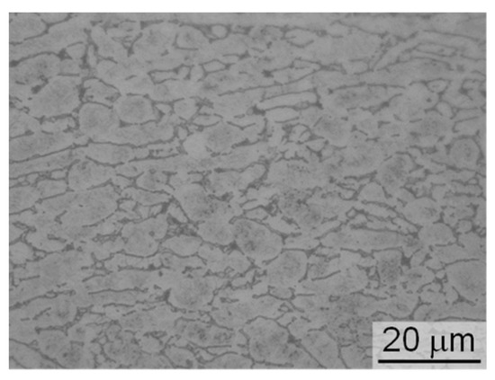The material used in this study was Ti-6Al-4V alloy (ELI (Extra Low Interstitial) grade). The tensile strength and 0.2% proof stress were 961 MPa and 851 MPa, respectively. Figure 1 shows an optical micrograph of the alloy, which contains equiaxed α and β phase grains. Plates of this alloy with a thickness of 11 mm were machined into disk-shaped specimens with a diameter of 17 mm and a thickness of 5 mm, using wire electrical discharge and precision cutting machines. These specimens were polished to a mirror finish using emery paper (#240 to #1200) and a SiO2 suspension. The polished specimens are referred to as the P series.