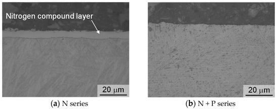 These results show that a compound layer and a diffusion layer were formed at the surface of the N series specimens while only a diffusion layer was formed at the surface of the N + P series specimens.