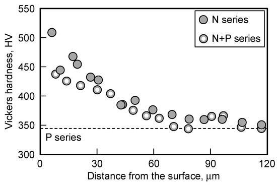 Figure 4 shows cross-sectional profiles of Vickers hardness for the N and N + P series specimens. Although the surface hardness for the N + P series specimen was reduced due to the removal of the compound layer, the surface of both specimens was harder than the interior. The increased hardness compared to the P series specimens indicates the presence of a nitrogen diffusion layer.