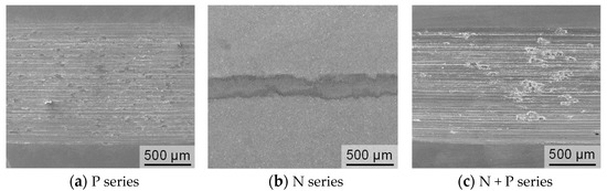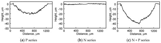 Reciprocating ball-on-disk wear tests were performed to investigate the wear resistance of the specimens. Figure 5 shows SEM micrographs of the wear tracks formed on the specimen surface. The N series (Figure 5b) showed a narrower wear track than the other specimens. The widths of the wear tracks formed on the P (Figure 5a) and N + P (Figure 5c) series specimens were almost the same. To examine the wear tracks in more detail, cross-sectional profiles were measured. Figure 6 illustrates the results. The N series specimen exhibited a relative small wear track (Figure 6b). In contrast, both P and N + P series specimens (Figure 6a,c) exhibited wide wear tracks, and that for the N + P series specimen was deeper. Table 1 summarizes the wear loss for the specimens during the tests. The wear loss for the N series specimen was less than that for the P series specimen, whereas the N + P series specimen showed the highest wear loss. These results indicate that the nitrogen compound layer on the N series specimens improved the wear resistance, whereas the nitrogen diffusion layer on the N + P series deteriorated the wear resistance.