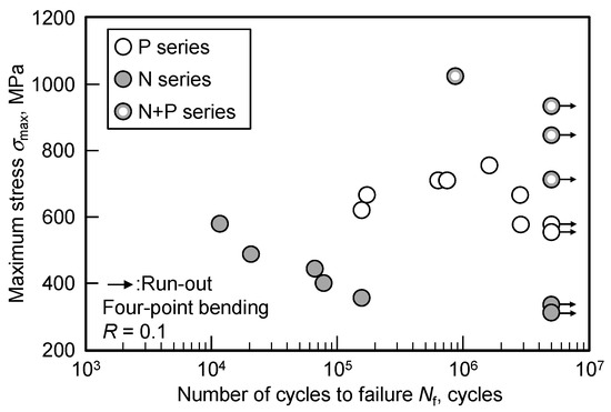 Four-point bending fatigue tests were carried out to investigate the fatigue properties of the specimens, and the results are shown in Figure 7. The N series specimen exhibited inferior fatigue properties than the P series specimen. The best results were obtained for the N + P series specimen.