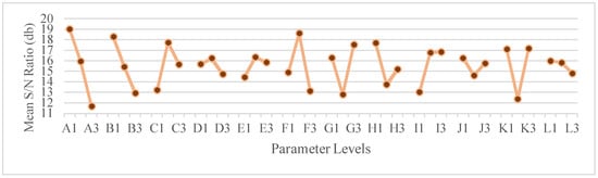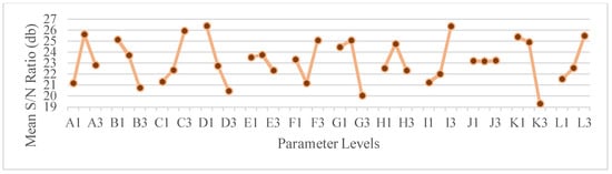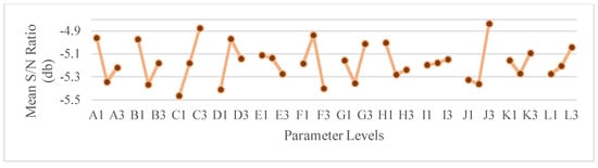 The graphs of the mean signal-to-noise ratio allowed the authors to select the optimal parameter sequence for each dimension. For Pulsed mode, the optimal combination for the bead width consists of the values of 0.1 s of Pre-gas flow, 0.5 s of Post-gas flow, 8 m/min of Wire feed speed, 0 of Anti-adhesion correction, 5 L/min Nominal gas value, 5 Gas factor, 140% Initial current, 0.3 s Slope 1, 100% Final current, 0.7 s Initial time, 1 s Final time and 0.1 s of Slope 2, corresponding to the sequence A1B1C2D2E2F2G3H1I3J1K3L1. For the bead penetration consists of the values of 0.5 s of Pre-gas flow, 0.5 s of Post-gas flow, 12 m/min of Wire feed speed, −0.2 of Anti-adhesion correction, 5 L/min of Nominal gas value, 10 Gas factor, 90% Initial current, 0.1 s of Slope 1, 100% of Final current, 1.5 s of Initial time, 0.2 s of Final time and 1 s of Slope 2, corresponding to the sequence A2B1C3D1E2F3G2H2I3J3K1L3. For the bead reinforcement consists of the values of 0.1 s of Pre-gas flow, 0.5 s of Post-gas flow, 12 m/min of Wire feed speed, 0 of Anti-adhesion correction, 15 L/min of Nominal gas value, 5 Gas factor, 140% Initial current, 0.3 s of Slope 1, 100% of Final current, 1.5 s of Initial time, 1 s of Final time and 1 s of Slope 2, corresponding to the sequence A1B1C3D2E1F2G3H1I3J3K3L3.