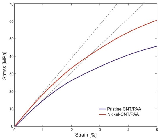 The representative stress–strain curves are reported in Figure 1. As expected, the nanocomposite with nickel-coated CNTs shows a significantly enhanced mechanical response with respect to the pristine CNT/PAA nanocomposite. When the two nanocomposite materials are loaded, they exhibit an elastic behavior up to a strain of 1%. A Young modulus of 1.497 GPa and 1.936 GPa are observed for the pristine CNT/PAA and Ni-CNT/PAA nanocomposites, respectively. Such outcome proves the effectiveness of the nickel nanoparticles which increase the density of the van der Waals interaction forces at the CNT/matrix interfaces. A 29% improvement of the elastic modulus is delivered in the interface-engineered nanocomposite with respect to the nanocomposite with unmodified interfaces.